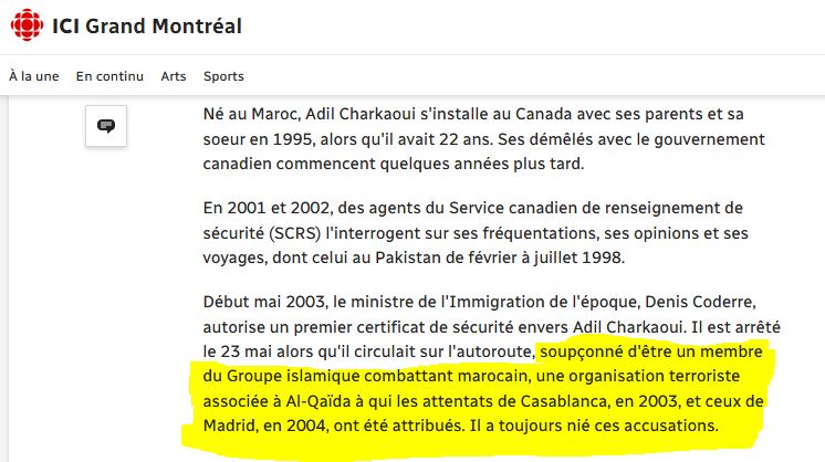 Adil Charkaoui, immigré au Canada 1995, il est arrêté par le gouvernement canadien en mai 2003. Les ministres de l'Immigration et de la Sécurité publique soutiennent que cet homme ne devrait pas obtenir la permission de demeurer au Canada. Il donnait des cours au Collège de Maisonneuve, certains de ses étudiants sont partis rejoindre l'État islamique et plusieurs n'en sont jamais revenus.