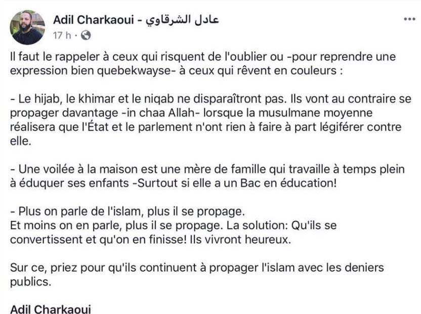 Mais avant tout , il faut-il comprendre que Québec Solidaire à participé indirectement ou directement à la manifestation. La porte-parole de la manif à caractère haineux tenue le dimanche 7 octobre est Safa Chebbi, la directrice de la campagne de Ève Torres, une candidature islamiste approuvée par le « chef » du Politburo de Québec Solidaire.