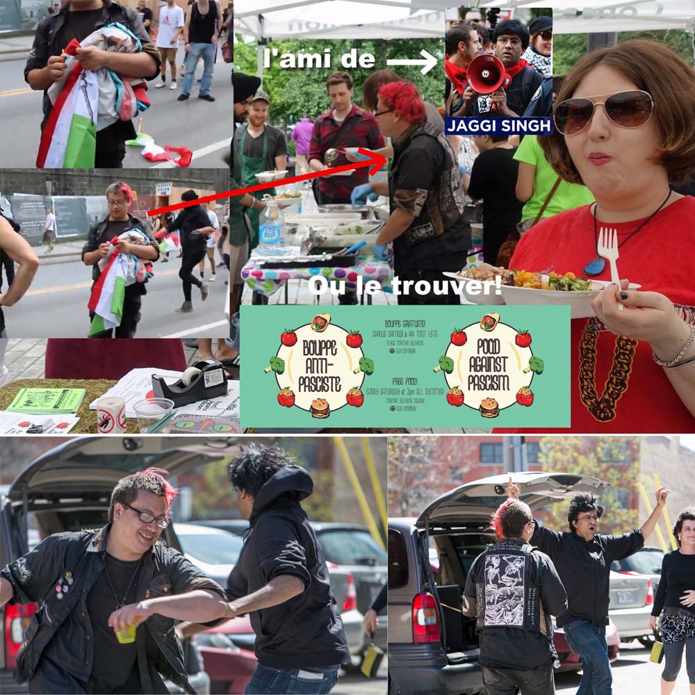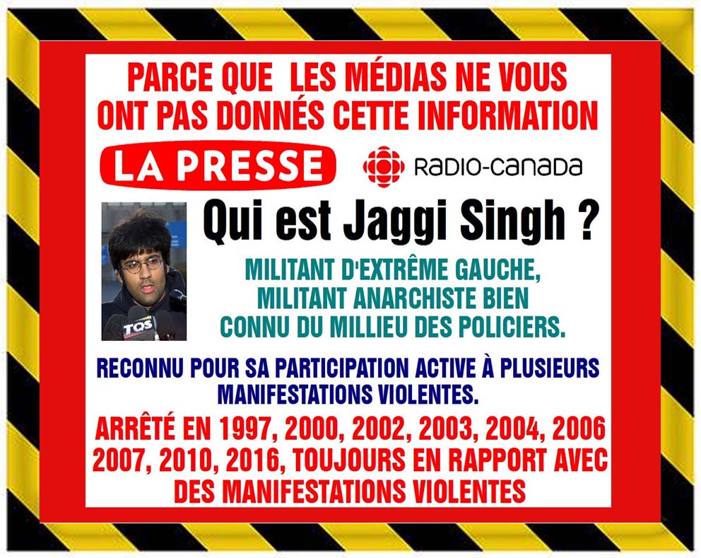 Jaggi Singh, est connu pour être un militant d'extrême gauche, connu surtout pour ses nombreux démêlé avec la justice, ce qu'il dit : il peut être nécessaire d'utiliser la violence contre les racistes, il est très rare de voir une manifestation sans violence quand celui-ci est présent.