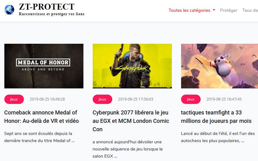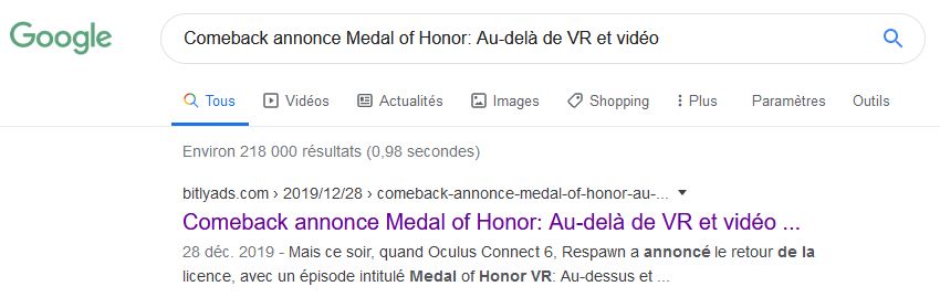 Dans le menu de ZT PROTECT, j'ai choisi la catégorie jeux, prenons l'article Comeback annonce Medal of Honor: Au-delà de VR et vidéo écrit par Justin jordan, l'article comporte 11 lignes, une centaine de mots. Faisons maintenant une recherche sur Google voir si cet article existe, voir s'il à été copié.