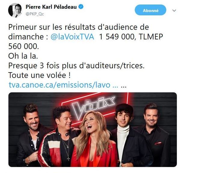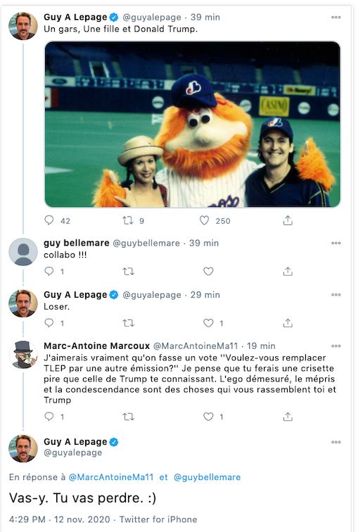 L'homme qui insulte après tout ce qui bouge sur les réseaux sociaux, millionnaire de propagande. Guy A Lepage s'est fait prendre à son propre jeu, Marc-Antoine Marcoux sur Twitter lui à proposé un sondage (Remplacé TLMEP par une autre émission) Guy À Lepage lui à répondu = Vas-y tu va perdre. :)