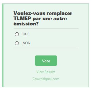 Continuons donc avec le fameux sondage, présentement 10 850 personnes qui on votés «Voulez-vous remplacer TLMEP par une autre émission?» c'est 8 485 qui aimeraient bien que TLMEP disparaisse, soit 78.2% et 2 360 personnes qui voudraient que l'émission reste , soit 21.8%.