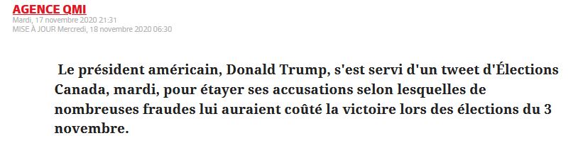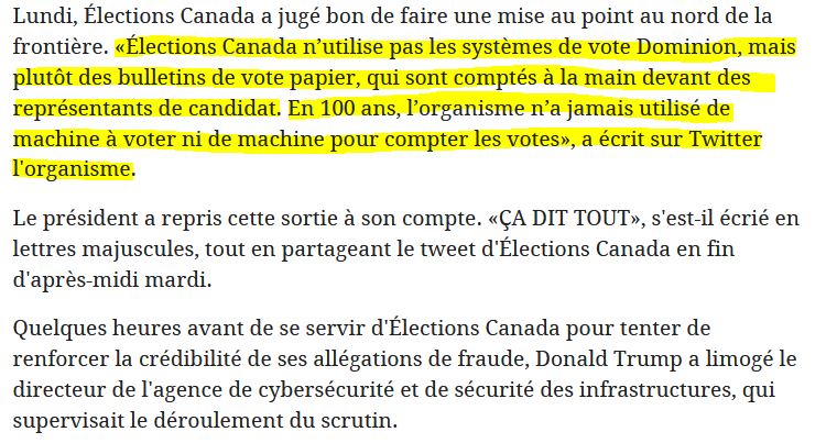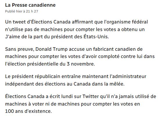 Plusieurs questions se posent, pourquoi une telle affirmation, pourquoi sentir le besoin de se faire rassurant, pourquoi ? Le Journal de Montréal a rapidement sorti la nouvelle sur le twitt de Élection Canada,, que les fameuses machines Dominion n'ont jamais été utilisées, mais le but était encore de discréditer Donald Trump.
