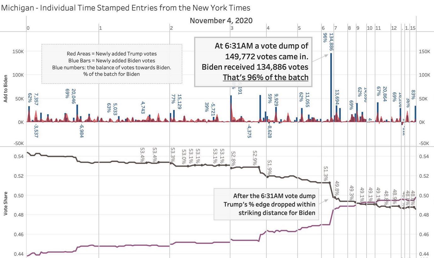 If anyone says otherwise, it's because they have shit in their eyes and corrupt like the Democrats. Take a good look at the Michigan table below in red, Trump ahead with 51.3% and Joe Biden, at 6:31 am receives a shot 134,886 votes and just after 6:31 am we can see in the other table Trump immediately drops.