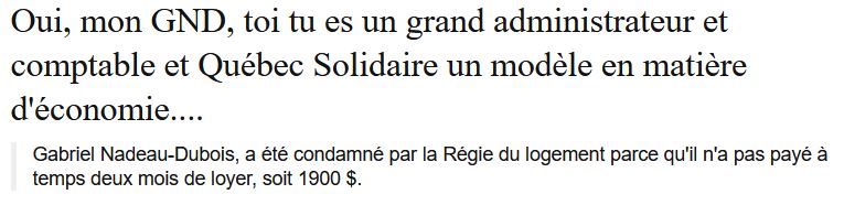 La CAQ se sert de Québec Solidaire, parce que Legault n'a pas les couilles pour expliquer pourquoi il veut imposer un impôt de pandémie, il n'a pas les couilles pour dire qu'il veut payer les dettes de ses amis. On remarquera que TVA, Le Droit, La Tribune, Le Devoir, La Presse, Radio-Canada tous les médias fake news subventionnés ont sortie la nouvelle, ce n'est pas pour rien, ont veut juste vous entrer dans tête, cet impôt! pour mieux vous voler.