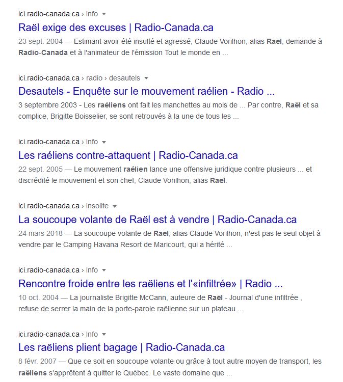 Mais, je me souviens de Raël, l'homme qui à fait les manchettes, Radio-Canada ne l'a pas ménagé, ce diffuseur n'a pas cessé de se moquer de lui, son accoutrement, le logo qu'il arborait, sa soucoupe volante, etc : La Question à Radio-Canada : quand sera-t-il des membres du Forum Économique Mondial arborant les logos de d'un secte ?