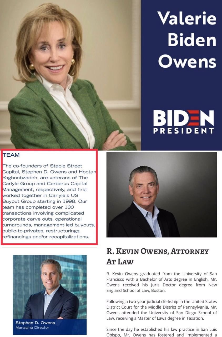 Valerie Biden Owens (la sœur de Joe Biden) est mariée à John Owens. Son frère, R. Kevin Owens, est le fondateur de Staple Street Investors, propriétaire de Dominion Voting. Staple Street Capital est une société de capital-investissement fondée en 2009 et basée à New York. Les cofondateurs sont Stephen D. Owens et Hootan Yaghoobzadeh.