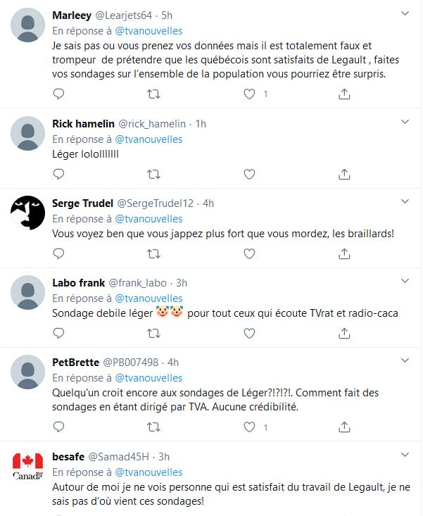 J'ai rarement eu l'occasion de terminer un sondage, car, c'est très rare que les sondages correspondent à mon profil, au profil recherché par Leger. Le nom de Jean-Marc Leger est comme on dite dans le jargon québécois "brulé sur les réseaux sociaux", ses sondages sont toxiques, visés qui fausses les statistiques relèvent de la supercherie.