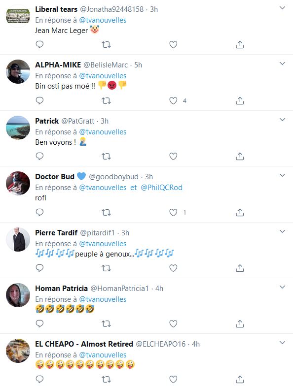 Avec Jean-Marc leger quand ce n’est pas un, c'est l'autre, soit Legault et Trudeau, pour les gens qui ne le savaient pas encore, l'entreprise Leger reçoit des millions pour favoriser les gouvernements, Leger , le beurre et le pain sur la table M Leger vient presque principalement des gouvernements.