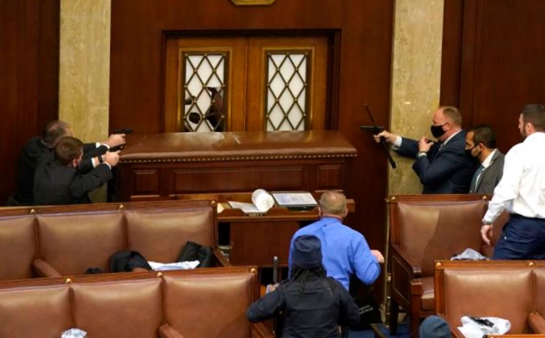 Tous les médias montrent une vidéo de l'intérieur, des hommes qui gardent la porte d'entrée, barricade d'un bureau, armée, ils tiennent en joue les manifestant pour les empêcher d'entrer. Le but des médias de ne pas montrer la vidéo de l'homme qui tire, bien sûr de mettre un peu la faute sur cette manifestante parce qu'elle était est soi-disant partisan de Donald Trump, mais aussi parce que l'opinion publique pèse lourd dans la balance et elle ne doit pas être en faveur de Trump.