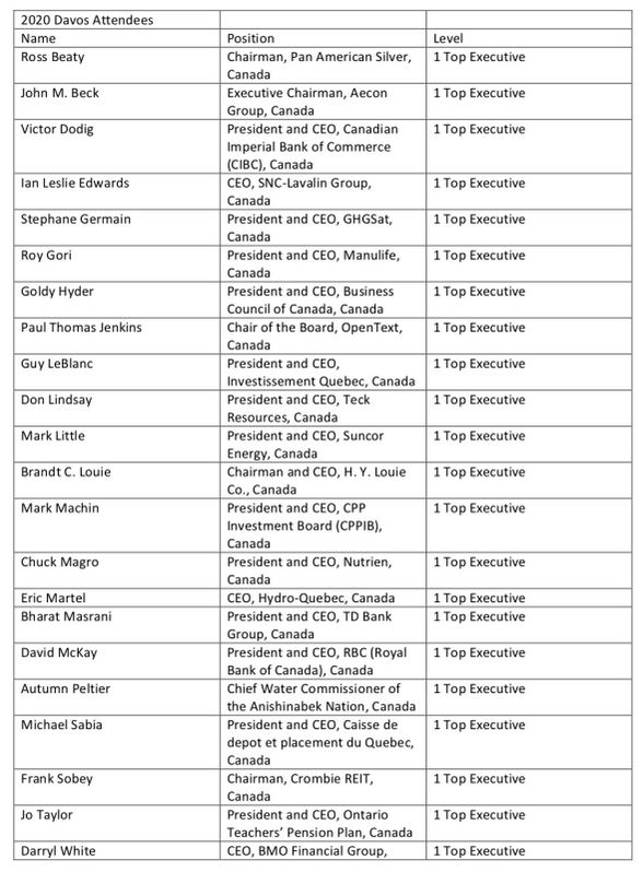 Nous avons été surpris par plusieurs participants au cours des trois dernières réunions. Au cours des trois années 2018, 2019 et 2020, Teck Corporation était présente. C'est l'entreprise qui a abandonné soudainement l'immense projet de sables bitumineux Frontier et dans la foulée de la réunion de Davos 2020. Cet investissement aurait à lui seul soutenu l’économie du Canada.