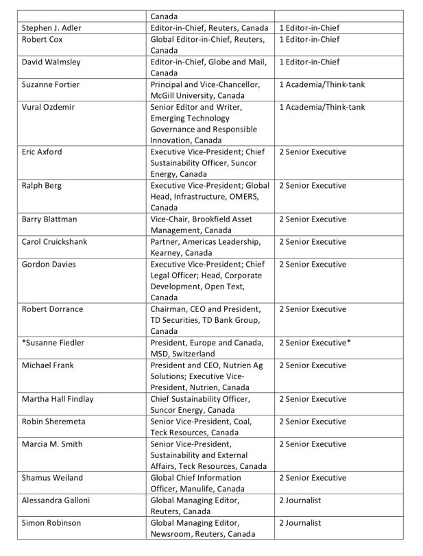 Michael Sabia était présent en 2020 et dirige désormais Freeland en tant que vice-ministre des Finances. En avril 2020, Sabia a été nommée présidente du conseil d'administration de la Banque de l'infrastructure du Canada. Il est toujours président de la Banque de l'infrastructure du Canada en octobre 2020.