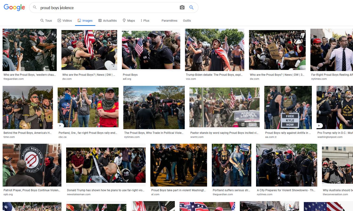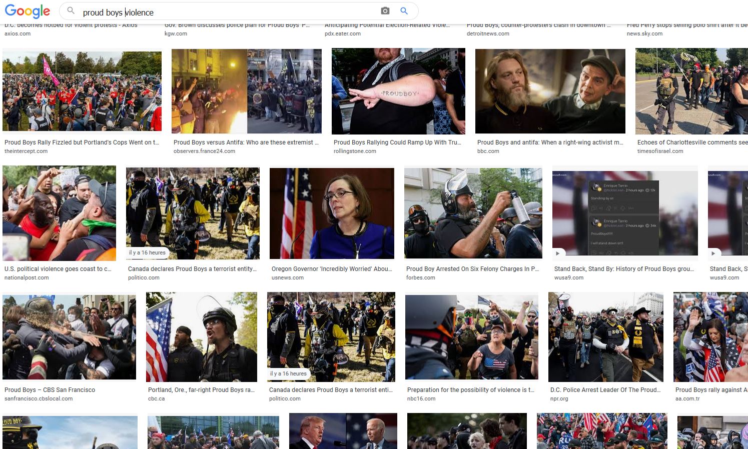 Voilà maintenant une recherche effectué sur Google sur les Proud Boys et les Antifas, vous allez vous apercevoir que les images parlent d'elles même, on commence par les Proud Boys: