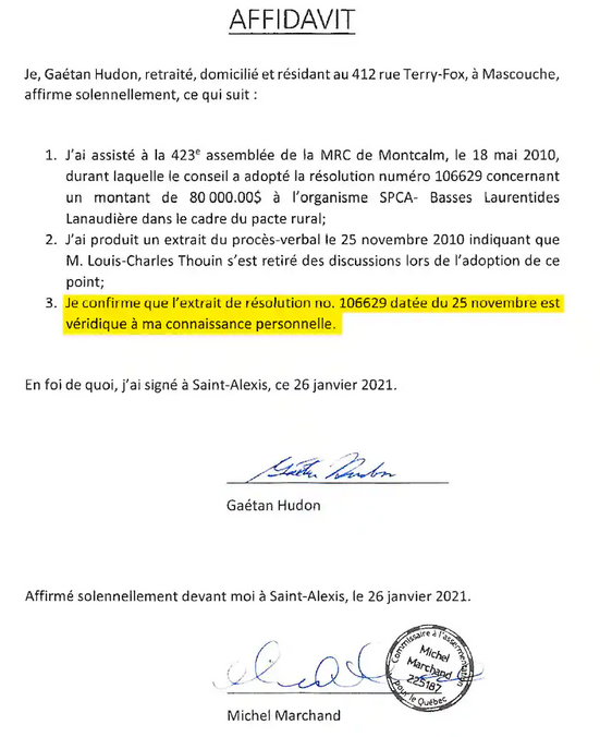 En janvier dernier, il a d’ailleurs obtenu à ce sujet un affidavit du directeur général de la MRC à l’époque, Gaétan Hudon. Il a convaincu la MRC de l’ajouter au procès-verbal qui indiquait qu’il était présent lors du vote.