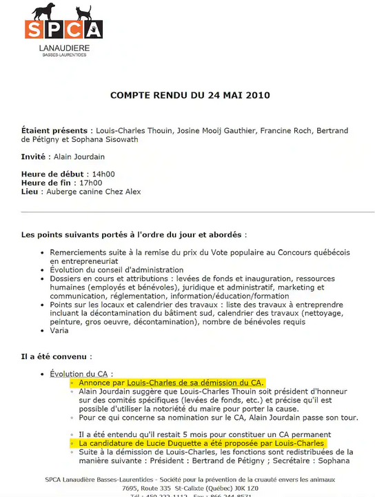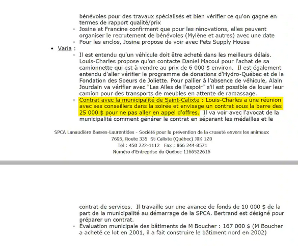 Il en avait aussi discuté lors d’une réunion du conseil d’administration de la SPCA LBL en mai 2010. Selon le procès-verbal ci-dessous, il cherchait alors une façon d’éviter un appel d’offres.