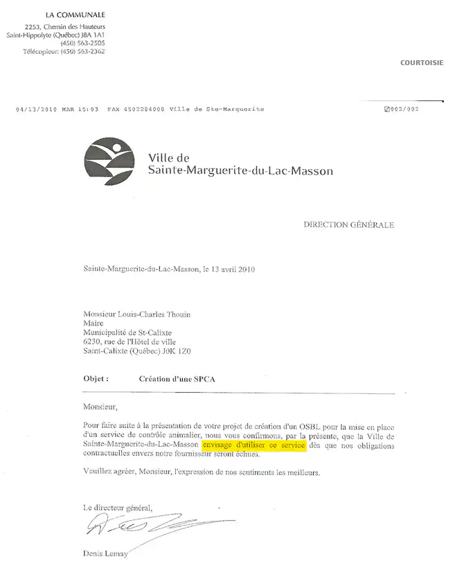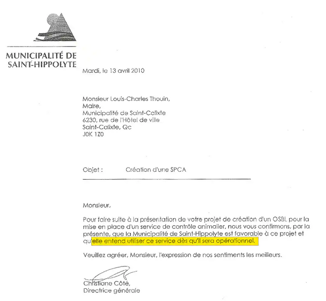 Avant même l’inscription officielle de la SPCA LBL au Registraire des entreprises, M. Thouin recevait déjà, à son nom et à l’hôtel de ville, des lettres de deux municipalités intéressées par les services de l’organisme.