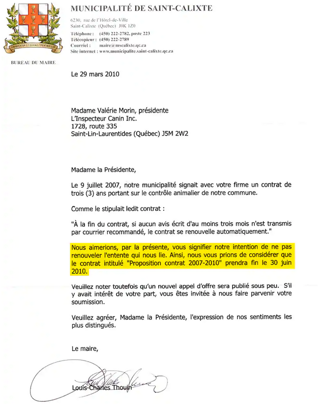 Simultanément, à titre de maire, il a personnellement mis fin à l’entente entre Saint-Calixte et la compagnie Inspecteur Canin, qui desservait alors la municipalité en matière de gestion animalière.