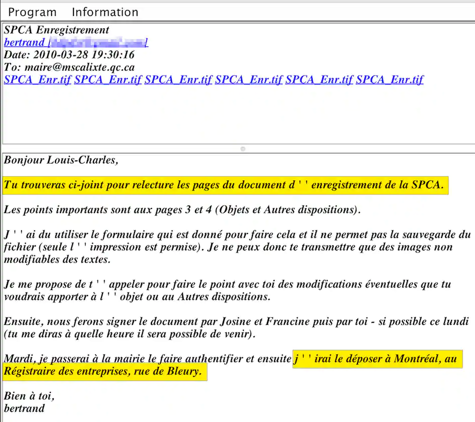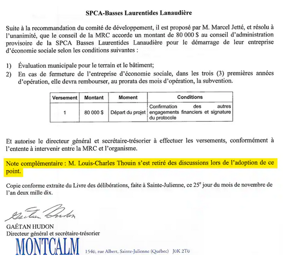 Notre Bureau d’enquête a réussi à mettre la main sur ce document complémentaire en contactant le ministère des Affaires municipales. Ce dernier l’avait obtenu de la MRC de Montcalm à la suite d’une plainte, en octobre 2010, pour conflit d’intérêts, en raison du rôle de M. Thouin dans le démarrage de la SPCA LBL à titre de maire et d’administrateur de l’OBNL.