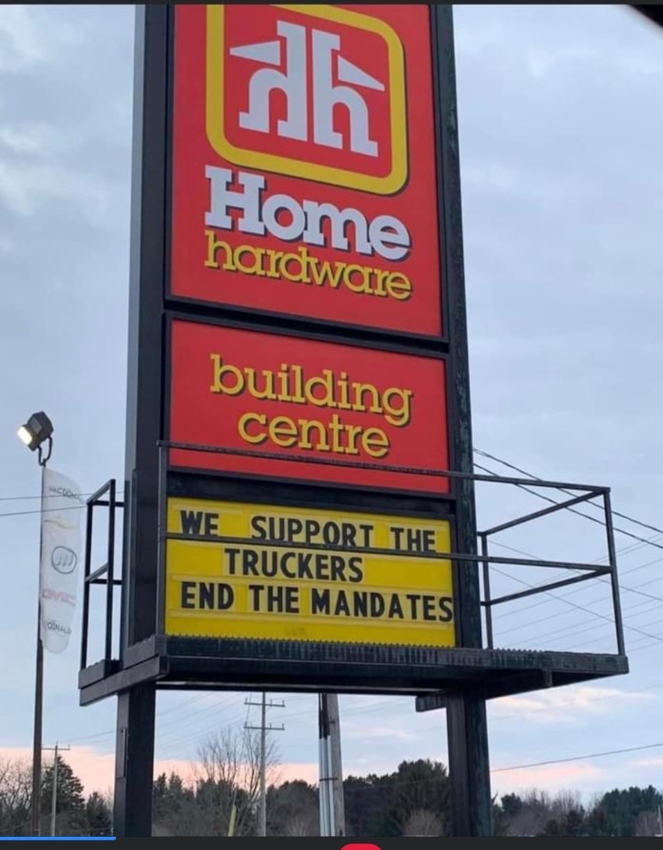 Home Hardware de l'Ontario supporte le Convoi de la liberté Catégorie : Média information Création : mercredi 2 février 2022 09:49 Publication : mercredi 2 février 2022 09:49 Imprimer Home Hardware de l'Ontario (Whitehorse) à inscrit sur son panneau de publicité qu'il supporte le «convoi de la liberté».