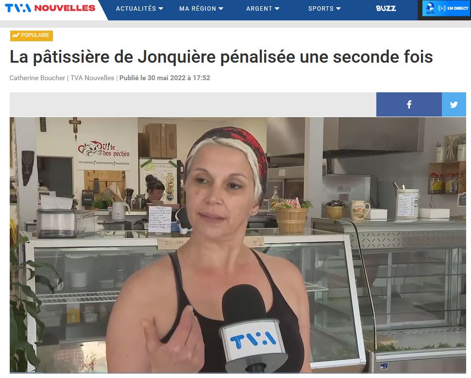 La réponse a été donnée par TVA Nouvelles : la propriétaire de la pâtisserie qui a défié les mesures sanitaires en ouvrant la salle à manger de son commerce de Jonquière vient d'être coupée de toutes subventions, elle ne pourra pas avoir de l'aide du gouvernement.