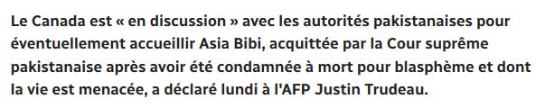 Si on pense deux minutes à la petite chrétienne Asia Bibi la Pakistanaise qui elle avait un châtiment de mort sur sa tête, accusée de blasphème envers l'islam (après avoir plongé son verre dans un seau d’eau pour le remplir, elle est accusée par une ouvrière musulmane de souiller la boisson de sa main de chrétienne.), finalement acquitté en appel par la Cour suprême en 2018, mais à dû se sauver à cause des menaces des Pakistanais qui demandaient la mise à mort de Bibi. Trudeau n'a jamais tenté de la ramener au Canada. Du moins, il là fait croi