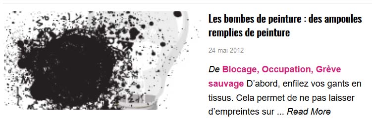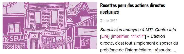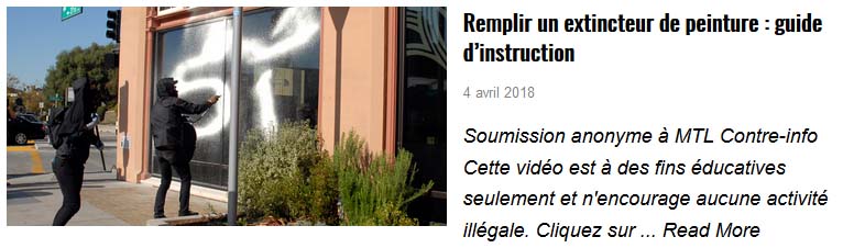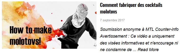 Voici un site internet monté par des antifas, Montréal Contre Information : voici une section du site internet, le guide pratique : quelques trucs qu'ils utilisent pour créer la peur et détruire les biens de L'État, même façon de faire que les terroristes.