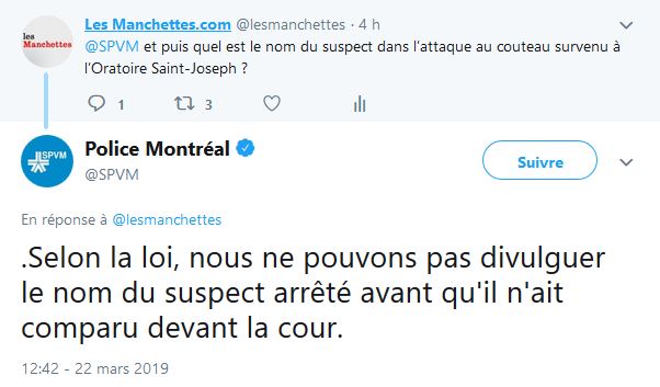 Les Manchettes à posé la question sur Twitter au SPVM, le nom du suspect appréhendé à l'Oratoire Saint-Joseph, voici la réponse reçue.