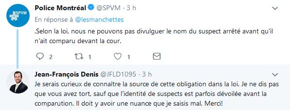 Certaines personnes ont répondu au SPVM, quelle est exactement cette loi pour ne pas vouloir dévoiler l'identité du suspect? L'identité de suspects est souvent dévoilée avant la comparution. Comme Jean-François Denis sur Twitter dit : «il doit y avoir une nuance que je saisis mal.»