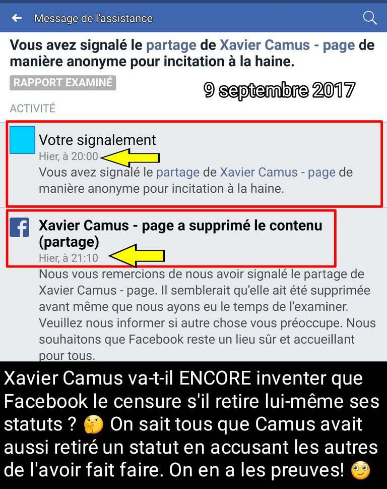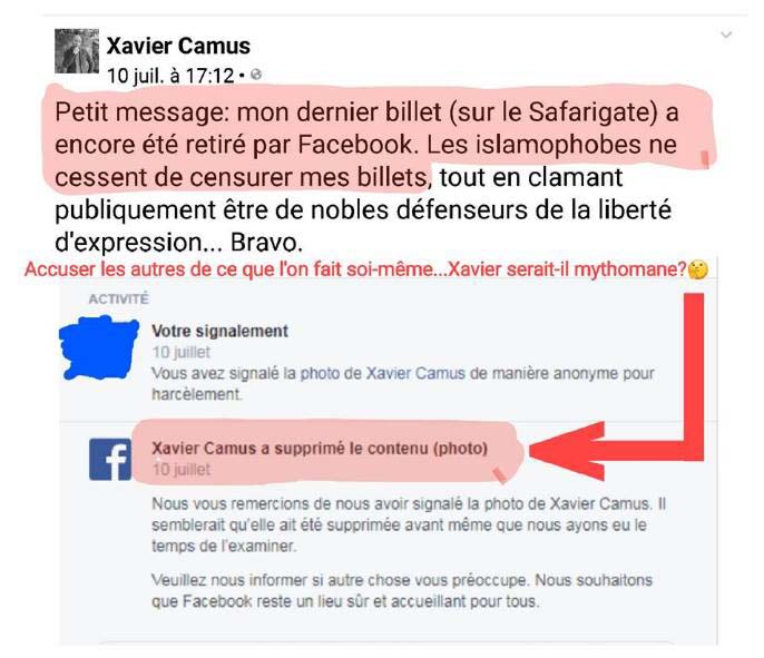 Quand on dit la cerise sur le sundae, c'est la cerise sur le sundae, dernièrement Camus s'est plaint le 10 juillet 2017 qu'une de ses publications sur Facebook a été retirée. (Mon dernier billet (sur le safarigate) a encore été retiré, les islamophobes ne cessent de censurer mes billets.