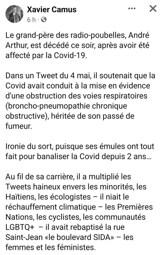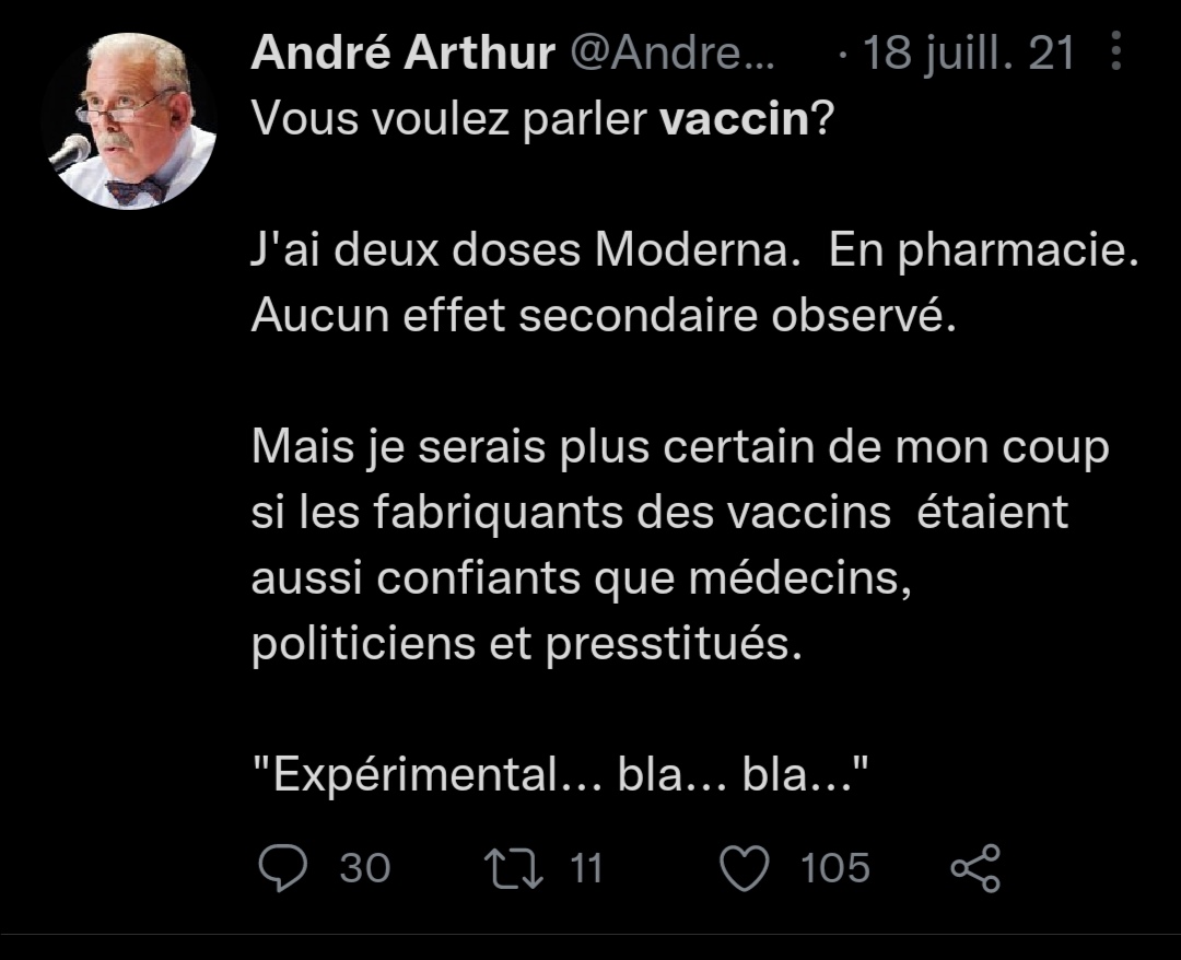 André Arthur était vacciné et n'était pas contre le vaccin qui maintenant nous le savons avec les nombreux documents de Pfizer tue! Mais est-ce que André Arthur est mort de la Covid, infecté comme il le dit, personne ne le sait, mais lui semble le savoir, il fait un rapprochement avec une publication tweet du 4 mai.