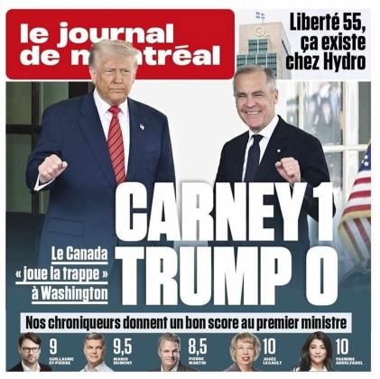Trump n'a eu que des éloges pour Mark Carney, quel flatteur, une vraie chanson d'amour, bref il lui a dit : "C'est un leader de classe mondiale. C'est un homme qui sait ce qu'il veut. Et je ne suis pas surpris de voir qu'il a gagné l'élection et l'a remportée largement. C'est un homme bien. Il fait un excellent travail et c'est un négociateur coriace." "C'est un excellent Premier ministre. Je veux dire, il pourrait me représenter à tout moment. C'est un leader très fort, très bon."«grand homme d'État, great man», un journaleux à demandé pourquoi il n'y avait pas encore d'accord malgré le fait que Carney soit un ("great man") et sur un ton humoristique : "Parce que moi aussi je veux être un grand homme !" ("Because I want to be a great man too !"), bref c'était simplement pour le ridiculiser ?