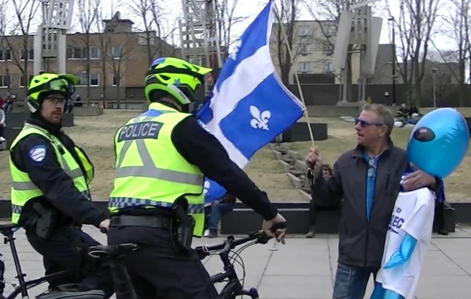 Toute une surprise pour Pierre Dion, qui est venu manifester avec son drapeau du Québec son désaccord sur la manifestation que tenait Warda Naili à place Émilie-Gamelin sur le projet de loi 21 de la CAQ.