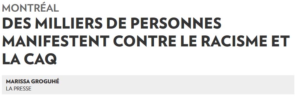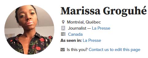 Dernièrement, j'ai reçu une demande d'entrevue de cette journaliste, on m'a vivement déconseillé de la rencontrer. On me disait que cette journaliste est raciste, raciste, anti-blanc, ben oui parce qu’aujourd'hui, s'est rendu une mode, il y a du raciste partout. Mais , oui, du raciste partout, partout partout, surtout le raciste québécois, les québécois sont racistes.