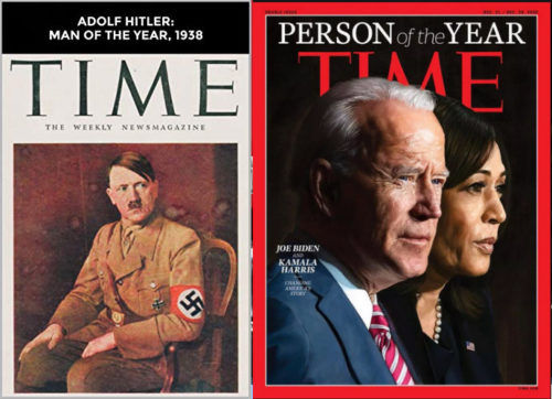 Décembre 1938, le Time, qui vient d’élire (à lui tout seul) le fraudeur sénile Joe Biden et l’ultra gauchiste à tendance fascisante Kamala Harris « Personnes de l’année », faisait de même pour Adolph Hitler, en expliquant son choix par l’article suivant :