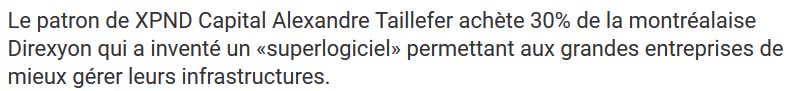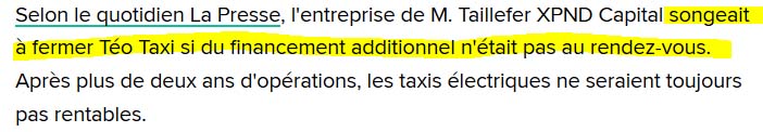 Mais pourquoi exactement Alexandre Taillefer s'est-il débarrassé de ses actions pourtant cette entreprise obtenaient des contrats très lucratifs. Est-ce qu'il a été poussé par une main généreuse, la main généreuse de la famille Desmarais ? Si tu nous vends tes parts, nous ferons avancer ton petit bébé Téo-Taxi, nous allons t'aider à obtenir de belles subventions de nos amis les libéraux qui sont au pouvoir. . Bien sûr, tout ça, c'est spéculatif.