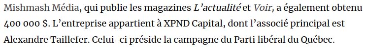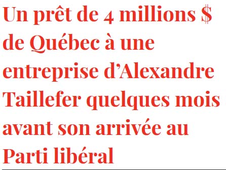 Dernièrement juste avant d'entrer en poste comme président de la campagne électorale du Parti libéral, celui-ci s'est vu offrir 4 millions, une autre belle subvention pour Téo Taxi. Non, non, enlevez-vous ça de la tête, voyons donc, Alexandre Taillefer n'ai pas été favorisé à cause de son implication au parti libéral, voyons ça serait malhonnête de prétendre ça!