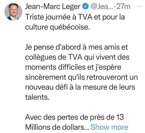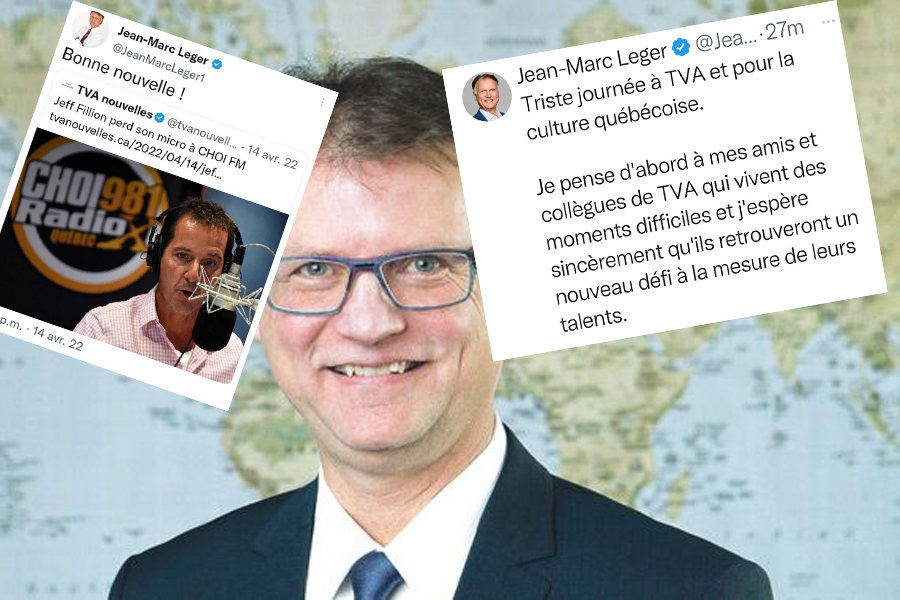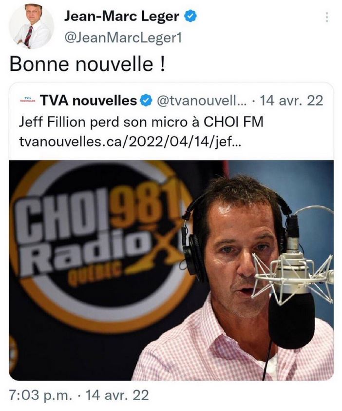 Bon pour Jean-Marc Léger, c'est triste que ses collègues perdent leurs emplois, mais pour les autres, il s'en réjouit ouvertement sur les réseaux sociaux! Le 14 avril il publie sur Twitter : Bonne Nouvelle! TVA annonce que Jeff Fillion perd son micro à CHOI-FM à cause bien sûr des pressions gouvernementales, bien sûr, il n'en parlera jamais, il se gardera une petite gêne, 95 % de ses sondages sont payés par eux.