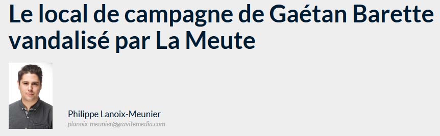 Gaétan Barette aurait été vandalisé ainsi que Coalition Avenir Québec (La CAQ). Ce geste d’éclat est vraisemblablement l‘œuvre de groupes d’extrême droit.
