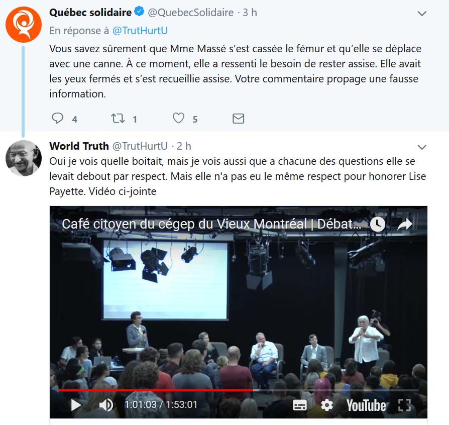 Selon un tweete de Québec Solidaire, Manon Massé se serait cassé le fémur, je veux bien le croire, pourtant elle s'est levé à chaque question, soit total de dix questions au débat électoral, plus de 1 minute chacune. Donc grosso modo, elle a tenu sur ses jambes plus de 10 minutes, toutefois pour un hommage à une grande dame qui a duré seulement 10 petites secondes, elle a préféré rester assise.