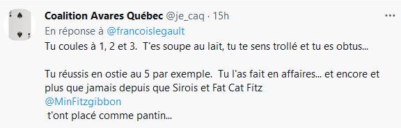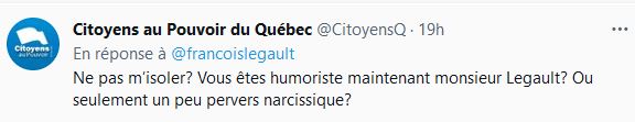 - Celle-là est forte en tabarnak... Ne pas m'isoler, «je laisse les gens répondre sur ce point» :