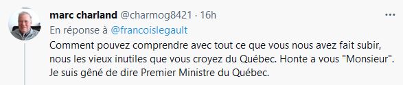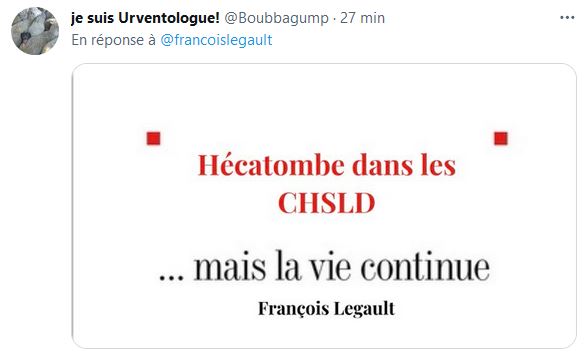 - Être de bonne humeur : en sachant que le gouvernement de la CAQ est responsable des nombreuses personnes décédées de façon atroce dans les CHSLD,« moi ça me rend de bonnes humeurs!»