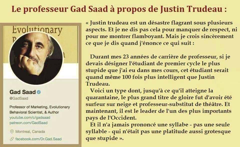 Il dit, si je devais désigner le plus stupide que j'ai eu à mes cours, cette étudiant serait quand même 100 fois plus intelligent que Justin Trudeau. Je pense que les paroles du professeur Gab ne sont pas une grande révélation en soit, ça ne fait que démontrer ce que la plupart des citoyens du Canada pense de notre premier ministre.