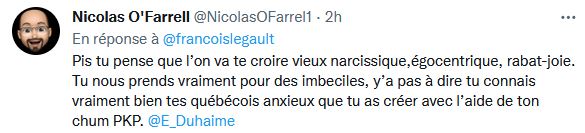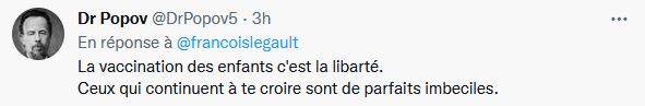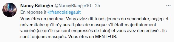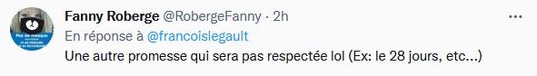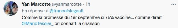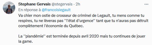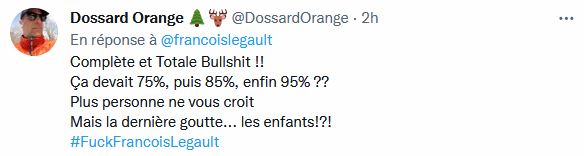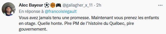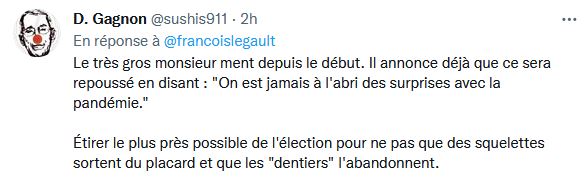 On savait que c'était pour arriver, on ne savait pas pourquoi et on ne le sait pas encore, dans un poste sur Twitter, François Legault nous dit «on n’est jamais à l’abri des surprises avec la pandémie» en fait il dit n'importe quoi, il y a une raison, mais la garde pour lui, car les statistiques au Québec sont très claires, aucun enfant n’est décédé de la Covid, donc il n'y a aucune raison.