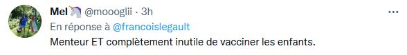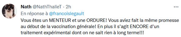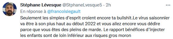 François Legault annonce vouloir vacciner vos enfants, avec un médicament extrêmement dangereux, c'est un produit expérimental , personne n’est capable de dire ce qu'il réserve dans l'avenir pour celui qui se le fait injecter. Si vous ne le savez pas, François Legault est un menteur pathologique, manipulateur, ce qu'il ne vous dit pas , même après la vaccination des 5 à 11 ans, il va maintenir l’urgence sanitaire!