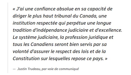 Cette décision est favorable à M. Trudeau, il le sait et tout le monde le sait, c'est pas moins de 2. 8 millions possible de votes pour lui. Évidemment ça pressait, car le juge en chef de la Cour suprême a remis sa décision le 19 janvier, quelques mois avant les élections. Le juge en chef Richard Wagner a rédigé le jugement de la majorité.