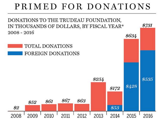 «Une analyse des révélations publiques de la Fondation Trudeau par le National Post a révélé que les dons à la fondation avaient considérablement augmenté depuis l’élection de Justin Trudeau en avril 2013 à la tête du parti libéral du Canada. L’argent versé par les donateurs étrangers à la fondation a augmenté chaque année depuis que Trudeau a revendiqué la direction du parti.