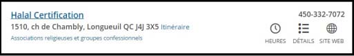 Autre joueur du secteur de la certification halal ! Le propriétaire, Abdallah Obeid, ne semble pas avoir encore recruté de clientèle. Son entreprise déclare comme activité économique « Analyse de produits et certification halal ». Son numéro d’entreprise est 2263382667, et elle est située au 9869, avenue Lausanne, Montréal (Québec) H1H 5A6.