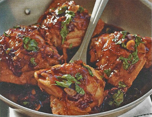 3. Pendant ce temps, remettez la poêle sur le feu. Faites-y fondre l'oignon et l'ail, en remuant constamment. Ajoutez le sucre, la sauce soja et le nuoc-mâm, et poursuivez la cuisson 3 minutes. Remettez le poulet dans la poêle avec la coriandre. Tournez les mon»;- de volaille pour bien les enduire de sauce.