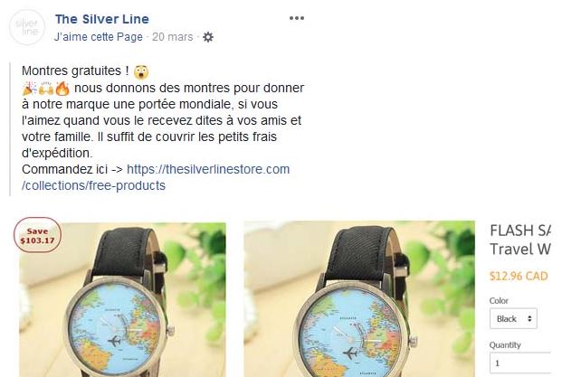 Ce commerçant vous dit que vous ne payez pas l'article acheté, l'article est gratuit, vous payez seulement les frais d'envois. Attention, au bout du compte vous avez bel et bien payé la montre et même qu'il est possible de ne pas la recevoir.