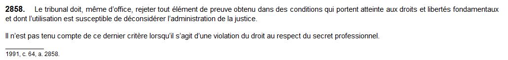 Quant à notre droit civil et, en particulier le droit sur la preuve civile, le Code civil du Québec, à l’article 2874, appuyé d’une longue liste de jurisprudences bien établies, prévoit que, en principe, les enregistrements de conversations effectués par un participant, à l’insu du ou des autres participants, sont recevables en preuve, sauf peut-être dans les cas où un droit fondamental aurait été violé.